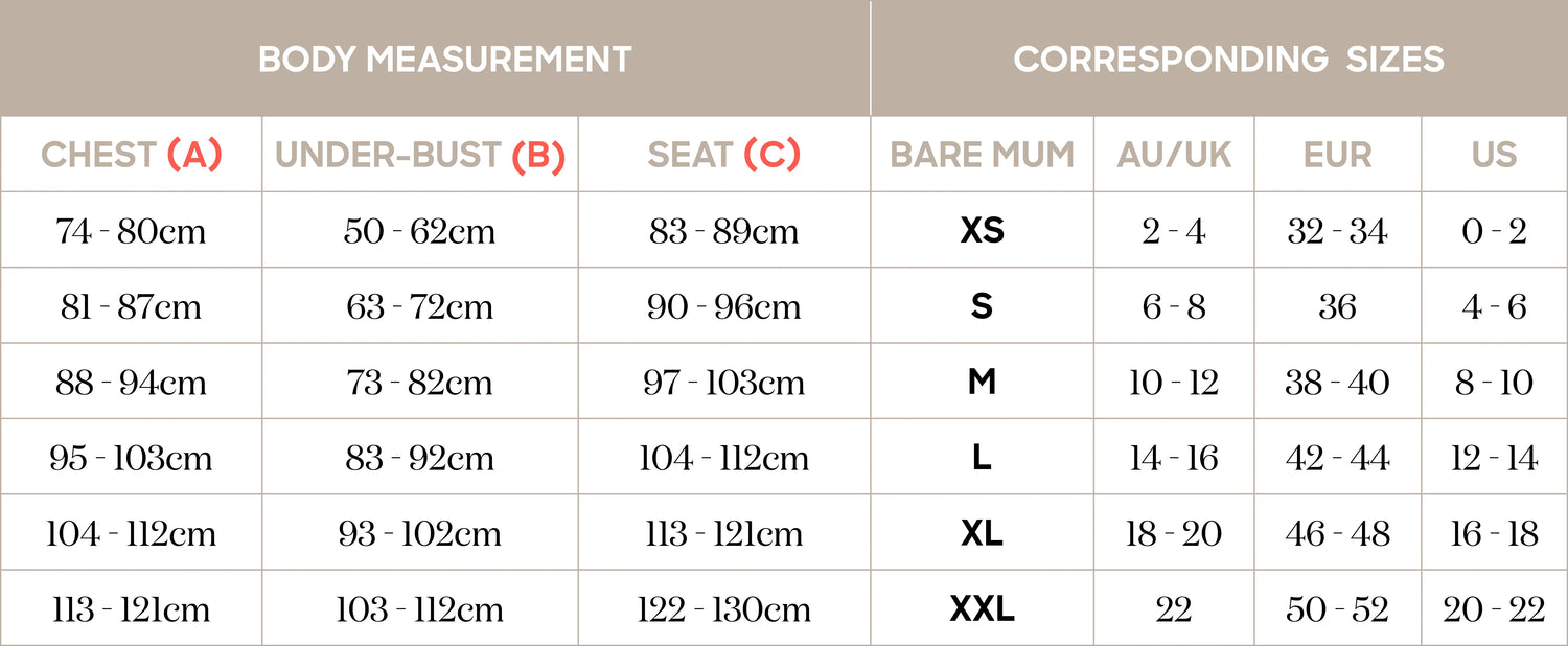 Still unsure about your size? Simply measure your body with measuring tape to find out your best fit. The chest measurement (A) is taken across the fullest part of your bust, preferably while wearing a non-padded bra. The under-bust measurement (B) is taken under the bust. The seat measurement (C) is taken around the fullest part of your hips.